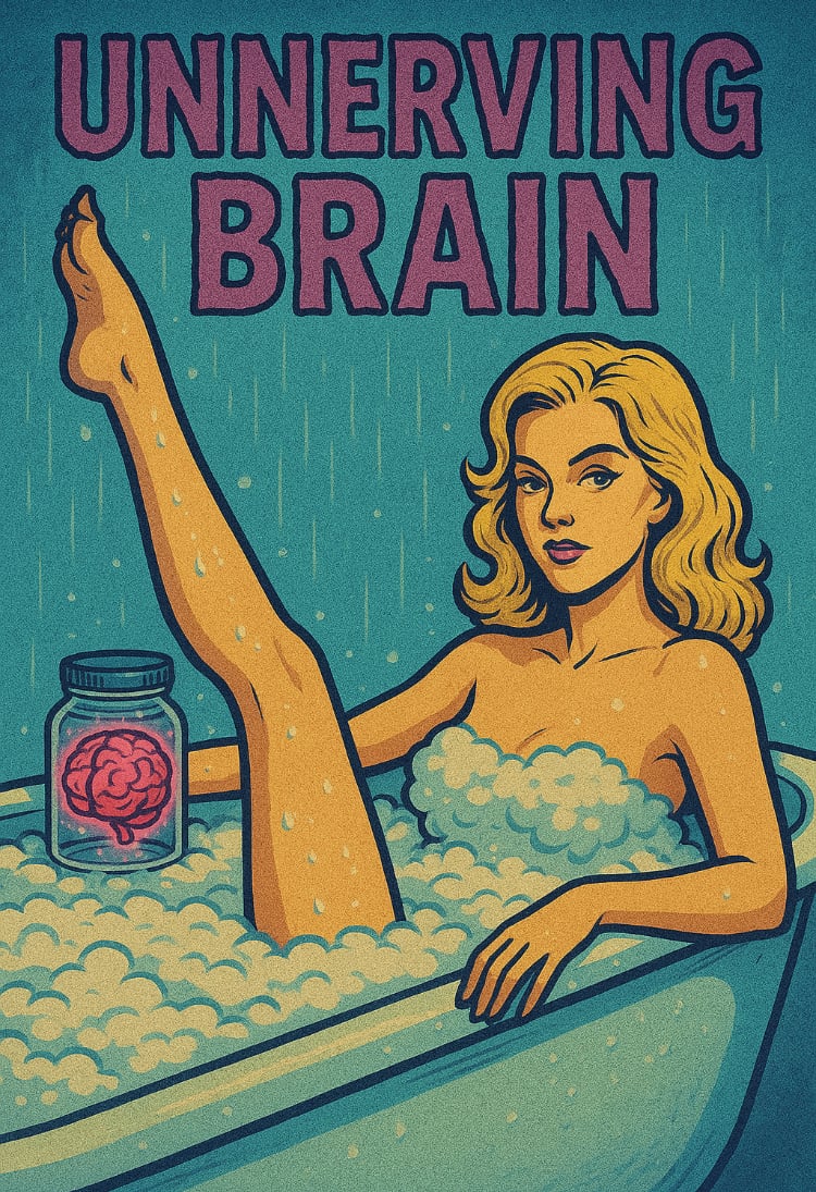 This boldly illustrated tee features a retro bombshell bathing in bubbles—with a brain in a jar casually soaking beside her. Equal parts seductive and surreal, “Soak & Cerebellum” is a twisted tribute to self-care and psychosis.