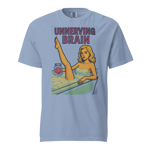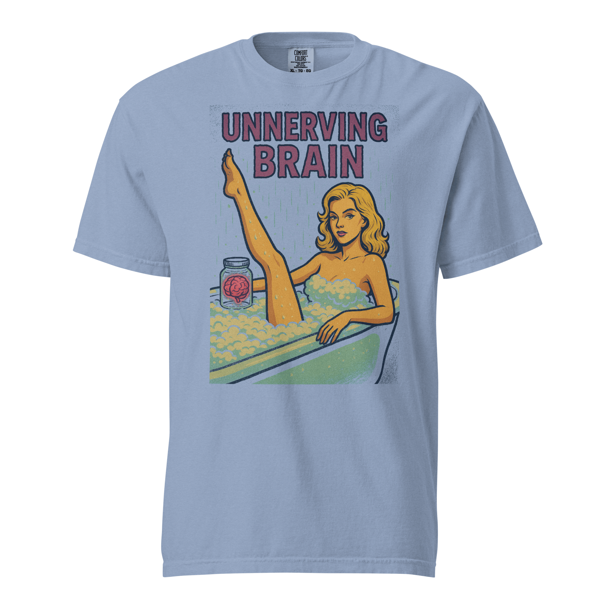 Printed on a soft, vintage blue tee, this design screams pulp horror meets bubblegum pop, soaked in Unnerving Brain’s signature off-kilter charm.